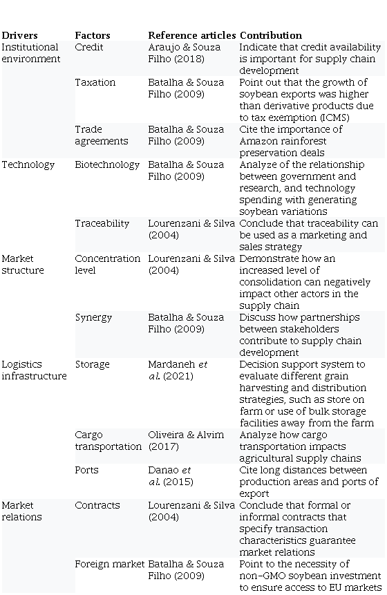 In the first part of the study, SSC drivers were characterized. Only grains directed for exportation were considered. In the last two crops (2017–2018 and 2018–2019), Brazil was responsible for 50% of all soybeans exported in the world (United States Department of Agriculture – USDA, 2020). Soybean meal and oil products were neither included in the research nor was the domestic consumption of the grain. In characterizing the drivers, this study considered the Institutional environment, the Technology and Market structure drivers developed by Batalha & Souza Filho (2009), and the Logistics infrastructure and Market relations drivers developed by the authors (Table 1).