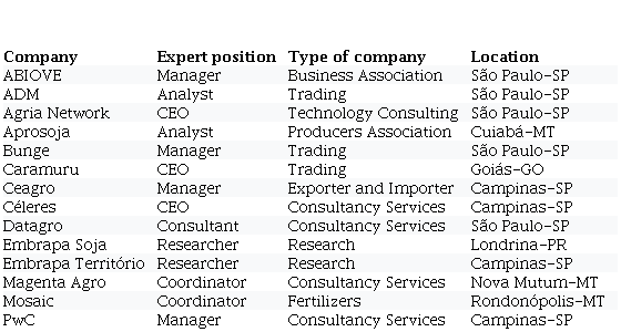 Besides having vision and access to information on the SSC, the experts interviewed have a prominent position within companies (Table 2). These companies were chosen because of their national representativeness, considering that sizeable agro-industrial trading companies have a high integration level. Due to the high degree of competitiveness of the agricultural commodities market, the vertical integration model is used to ensure greater control of the chain, seeking to create value in its various domains (Oliveira & Schneider, 2016). Some trading companies even operate from the supply of agricultural inputs to the distribution of products directly to their customers. Archer Daniels Midland (ADM), Bunge, Cargill, Louis Dreyfus and Amaggi stand out among the trading companies with a high degree of vertical integration. The first four companies are foreign multinationals that lead both the world agricultural commodities market and the Brazilian market. They form the group known worldwide as ABCD, an acronym for their names (Oliveira & Alvim, 2017; Oliveira & Schneider, 2016). These companies have vessels, ports, railways, refineries, silos, mills and factories, and, together, represent 70% of the world market for agricultural commodities (Santos & Glass, 2018) and include the different stakeholders (business association, producers association, consultancy services, trading, research institutions, fertilizers) in the SSC (Table 2).