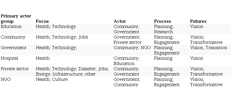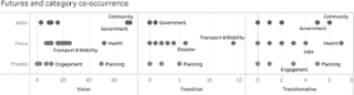 Mentions of visions typically accompanied community and government actors and planning processes focused on health. Meanwhile, discussions of transitions were more often related to the topic areas of planning for transport and mobility and disaster with government actors, and transformation was related to the topics of planning and engagement between community and government with a focus on health and jobs (Figure 8).