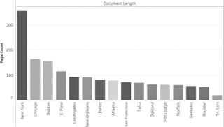 As noted in Table 1 above, the cities included in the analysis are vastly different in terms of population size, geographic location, economics and environmental risk. The 100RC resilience planning documents also varied significantly in length, ranging from 19 pages (St. Luis, MO) to 354 pages (New York, NY), as demonstrated in Figure 9 below.