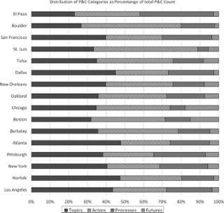 Looking at the distribution of defining P&C categories (topics, actors, processes and futures) for each city, a similar pattern emerges across all cities. In general, P&C topics are defined most frequently, followed by the actors, then the processes and, least often, the futures. However, there is some variation across the cities. For example, Atlanta and Norfolk lead in defining the focus areas and topic of P&Cs, specifying this information nearly 50% of the time. For instance, on page 33 of the Norfolk resilience document, they state: