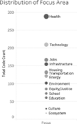 Analysis revealed that nearly all mentions of P&Cs in the urban resilience planning documents noted a specific topic area for the work. In total, 16 areas emerged, the focus on health being the most prevalent. The 16 focus areas were, in order of prevalence: health, technology, disaster, water, jobs, infrastructure, transportation and mobility, housing, energy, environment, ecosystem, food, school, education, equity/justice and culture. Health was noted as a focus area for P&Cs nearly 300 times, followed by technology, mentioned over 200 times, with all other topics being mentioned fewer than 200 times (Figure 3).
