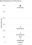 A few key findings emerge when we examine the distributions of co-occurrences for each actor group. For instance, partnerships focus on a broad distribution of topics between community, government and private sector when exploring community as an actor. Besides, the processes for collaboration are often discussed. For each actor group, a similar sort of signature pattern of P&C format arises. These findings are summarized in Figure 5 and Table 3.