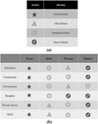 In Figure 5, see in the item a); the symbols and associated meanings that describe how often a category were defined. In the item b); it is detailed a breakdown of each actor group and how often partnership focus area, other actors, processes and futures were defined in the description of the partnership.