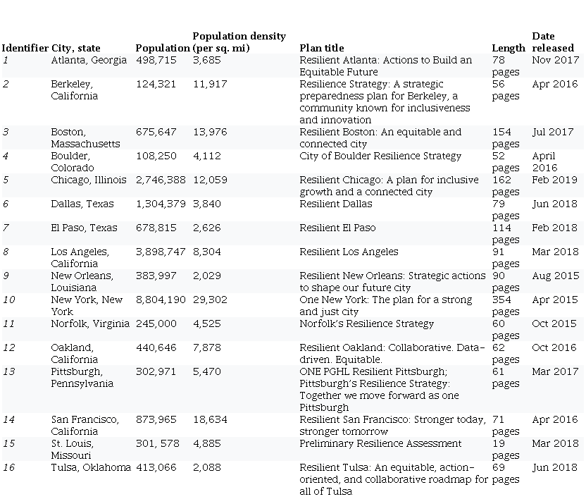 This study examines US cities' urban resilience plans and strategies and their characterization of P&Cs. This is achieved via a deductive content analysis of all 16 of the 100RC strategy documents produced in US cities (Table 1 and Figure 1).