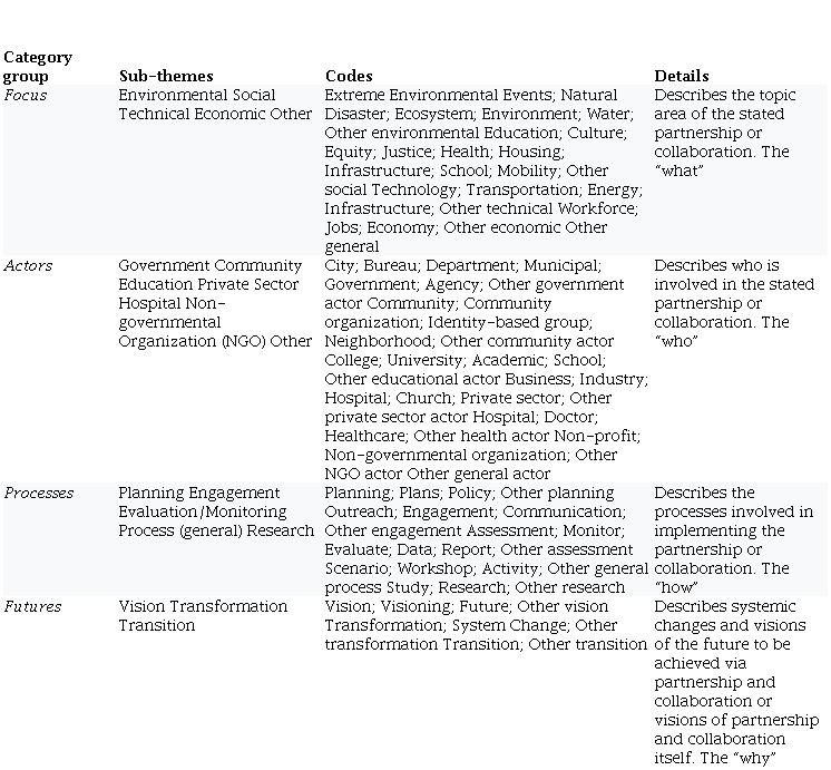 A description of an observed phenomenon's distinctive nature and features must be generated to characterize it. Therefore, a document content analysis was used to analyze proposed P&Cs within the 16 US city's resilience planning documents following methods outlined by Vaismoradi, Turunen, and Bondas (2013). The urban resilience planning documents were closely read to find sections where the documents discussed P&Cs, and this identified text was analyzed. Coded categories were derived directly from the text data and then sorted into sub-theme and overall category groups (Table 2). Five district category groups emerged where P&Cs were mentioned and defined: actors (who is involved in the partnership action), process (how the partnership is implemented), focus (what is the topic area of the partnership) and futures (why the partnership is needed). Co-occurrence tables were generated to understand better the full context of the proposed P&Cs, as well as a cross-city comparison to draw out the most prevalent similarities and differences in approach to resilience P&Cs across the 16 cities in the USA.