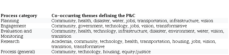 Planning was perceived as the most dominant process, mentioned alongside P&Cs over 1,000 times (almost more than the number of times all other processes were mentioned combined). Planning was most often discussed in relation to community, health, disaster, water, jobs, transportation and visioning. Table 4 summarizes the results from each process category and the most often co-occurring codes within the actors, topics and futures categories.