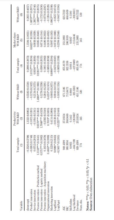 Consequently, innovative companies with R&D are mainly prone to implement product innovation to increase their market share, while innovative companies without R&D make innovative efforts (product, service, process and marketing innovation) to increase their sales. At this point, it is important to highlight that although the sample size may affect the statistical inference, the data used in the analyses correspond to a survey carried out by the official Peruvian institute of statistics at the national level. Therefore, we can assume that the sample is representative and of sufficient size for the inference analysis.