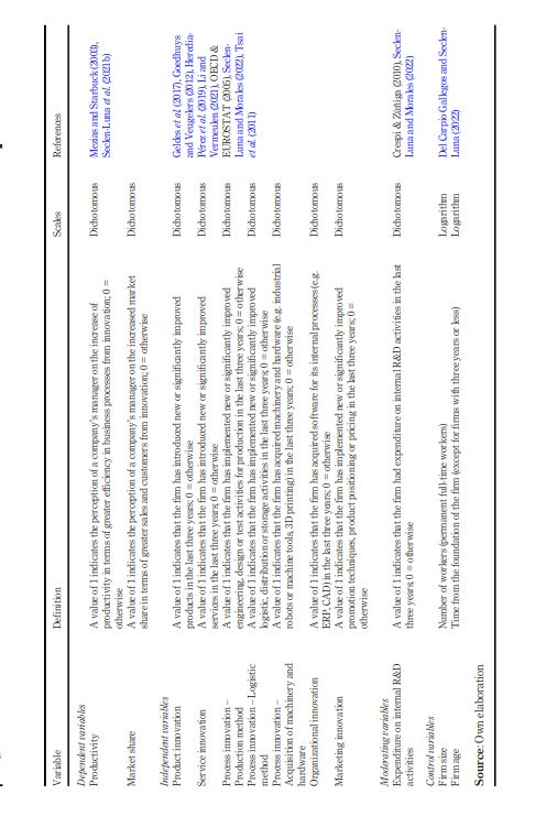 Lastly, this research considered the relevance of expenditure on R&D as a moderating variable in this relationship and measured it on a dichotomous scale (Crespi & Zúñiga, 2012). To control the sample, we included information on firm size and firm age variables. The extant literature shows that traditional large firms are better positioned to exploit technological acquisition and technological innovations because they have easier access to external funding for innovation and cover the fixed costs of the R&D activities needed to develop new products (Shefer & Frenkel, 2005). By contrast, smaller firms tend to carry out technological acquisition and aim at process innovation (Conte & Vivarelli, 2014). All of the above is usually consistent with the accumulated experience; however, evidence shows that younger firms invest more in R&D than older firms (Mariev et al., 2022).Table 2 shows the definitions of the variables used in this study