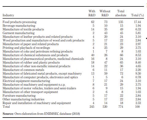 As in any scientific study, one of the limitations of this study is that, in developing countries, the same R&D result indicators are often used for firms that participate in developed markets. Hence, the evaluations of the relationships between traditional analysis variables do not generate the same results. Furthermore, the lack of measurement of intermediate result indicators does not facilitate the analysis. In addition, the low number of observations for the study variables restrict the analysis at an industrial level; thus, interpretations are only at the manufacturers’ level as a whole and not by industrial branches.