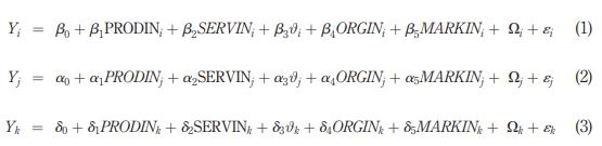 where Y is the dependent variable of each regression model, and the sub-index i refers to the total number of firms. The sub-index j refers to the firms with R&D, whereas the sub-index k refers to the firms without R&D. PRODINi,j,k is the variable product innovation, SERVINi,j,k is the variable service innovation, #i,j,k is a vector of process innovation variables including production method, logistic method and acquisition of machinery. ORGINi,j,k is the variable organizational innovation, MARKINi,j,k is the variable marketing innovation. Xi,j,k is a vector of control variables including firm size and firm age, and «i,j,k is the error term