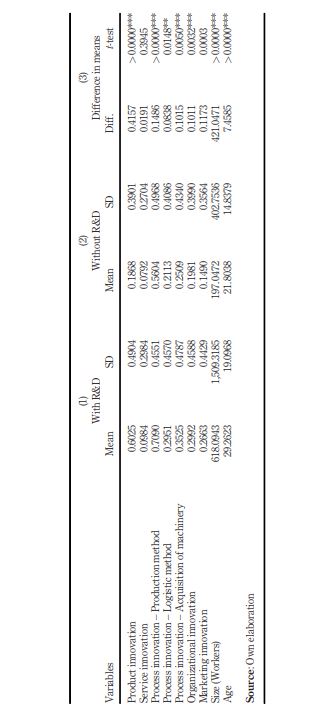 Table 3 shows the statistical summary according to R&D investment in companies. The results indicate that despite a low proportion of companies with R&D investments (31.6%), they have implemented more innovation than companies without R&D. Furthermore, it is possible to observe that the production method is the most systematic way of innovating for companies and services. The t-tests confirm that there is a difference in means. This study grouped innovative companies according to their investments in R&D because this activity could be considered crucial resource for creating innovation, even in a crisis (Lome et al., 2016), and also has positive associations with business performance, such as productivity (Tsai & Wang, 2004) and market value performance (Wang et al., 2017). These criteria acquire high relevance because, in contexts where innovation ecosystems are not mature, R&D activities are incipient and may not be attractive for companies, especially when competition from unregistered firms reduces R&D incentives and therefore may not be a differentiator for competition, thus affecting companies’ productivity (Heredia-Perez et al., 2018).