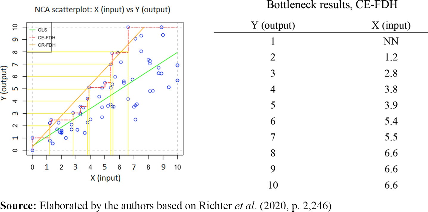 Finally, the NCA also displays a result named bottleneck (right side of Figure 1). The researcher can choose between percentage or original values of variables and then inform the exact value that X bounds Y (yellow lines). In this illustration, since the scale is from 0 to 10, we can easily interpret interchangeably that, if we intent obtain an output of Y = 7 (70%), we need at least an input of X = 5.5 (55%); otherwise, the output will be impossible. Obviously, if this condition was satisfied it still configures a nonsufficient condition to the output (Y) happening, but it is certain that, if not a certain amount of X, then not at all a certain amount of Y. This is a strong appealing to policy marking analysis and formulation as the bottleneck results provide an “in kind” qualitative evidence (that X is necessary for Y) and, most important, an “in degree” quantitative extrapolation states that at least a minimum amount of X is a necessary condition to make achieving a given level Y of output possible.