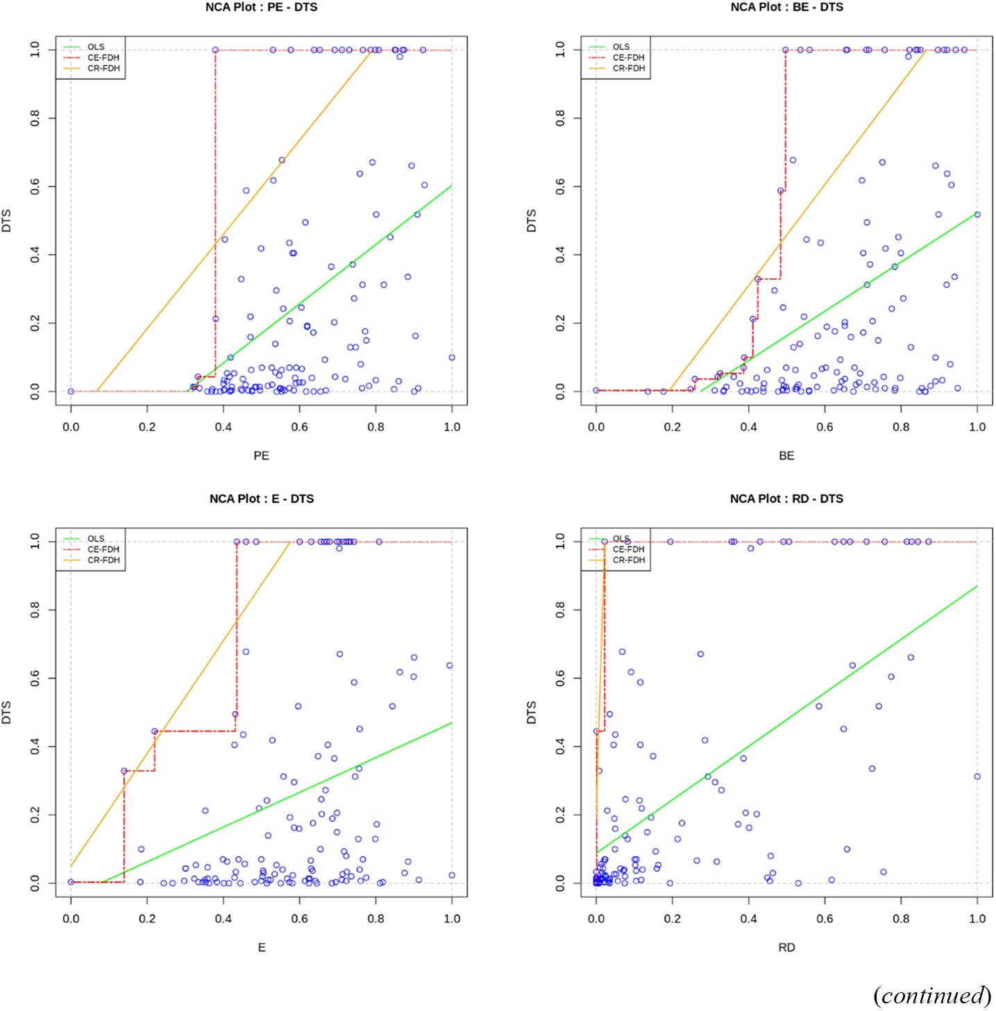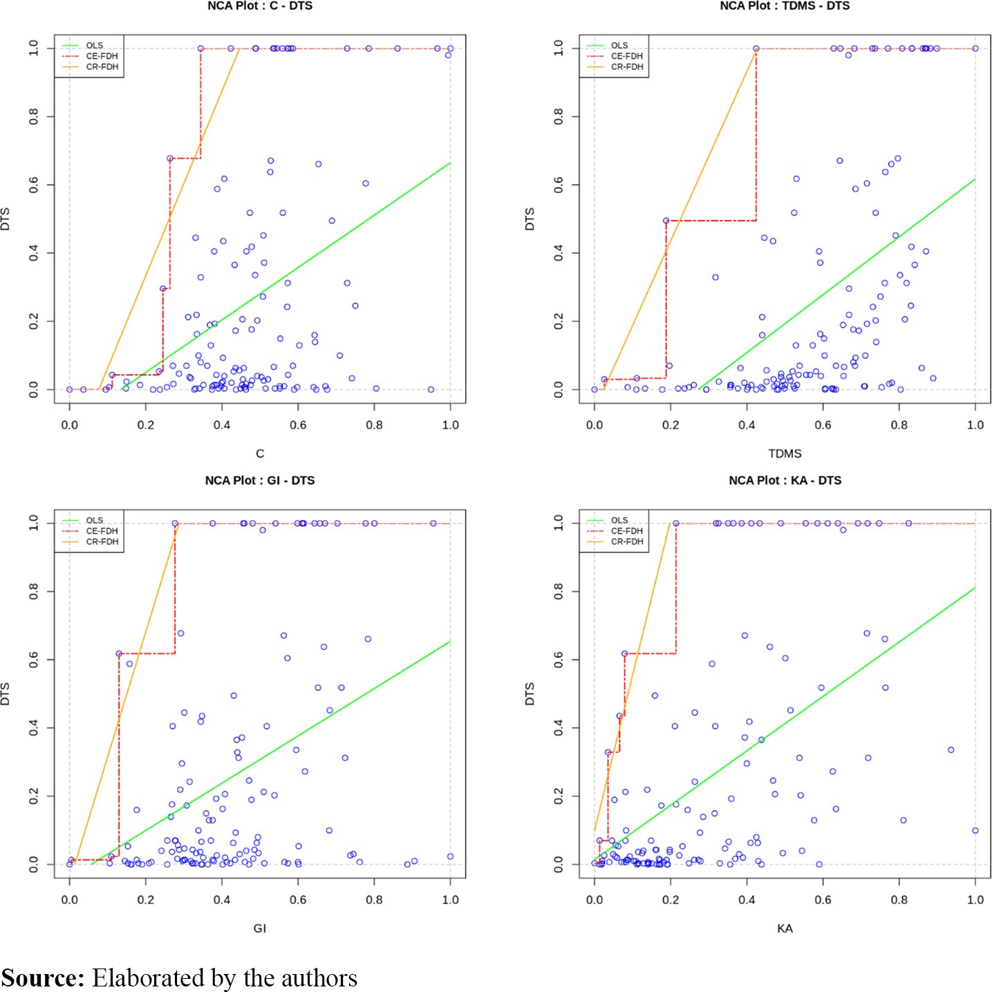 (orange); ceiling envelopment-free disposal hull (CE-FDH) line (red). The area above this ceiling line – top left corner on Figure 1 – is named empty space, which suggests that high output levels (Y) cannot be achieved by low input levels (X). Computing the proportion of empty space size in relation to the total space (TS) gives us the effect size (d) statistic, a measure of necessity. Therefore, the greater the ES, the greater the restriction imposed by X to Y (Dul, 2020). To trace the ceiling line, we selected the CE-FDH, a method recommended when the sample is composed of a limited number of outputs. Figure 1 shows that the benefit of using this technique (CE-FDH) is its 100% accuracy, that is, no observations are within the empty space.