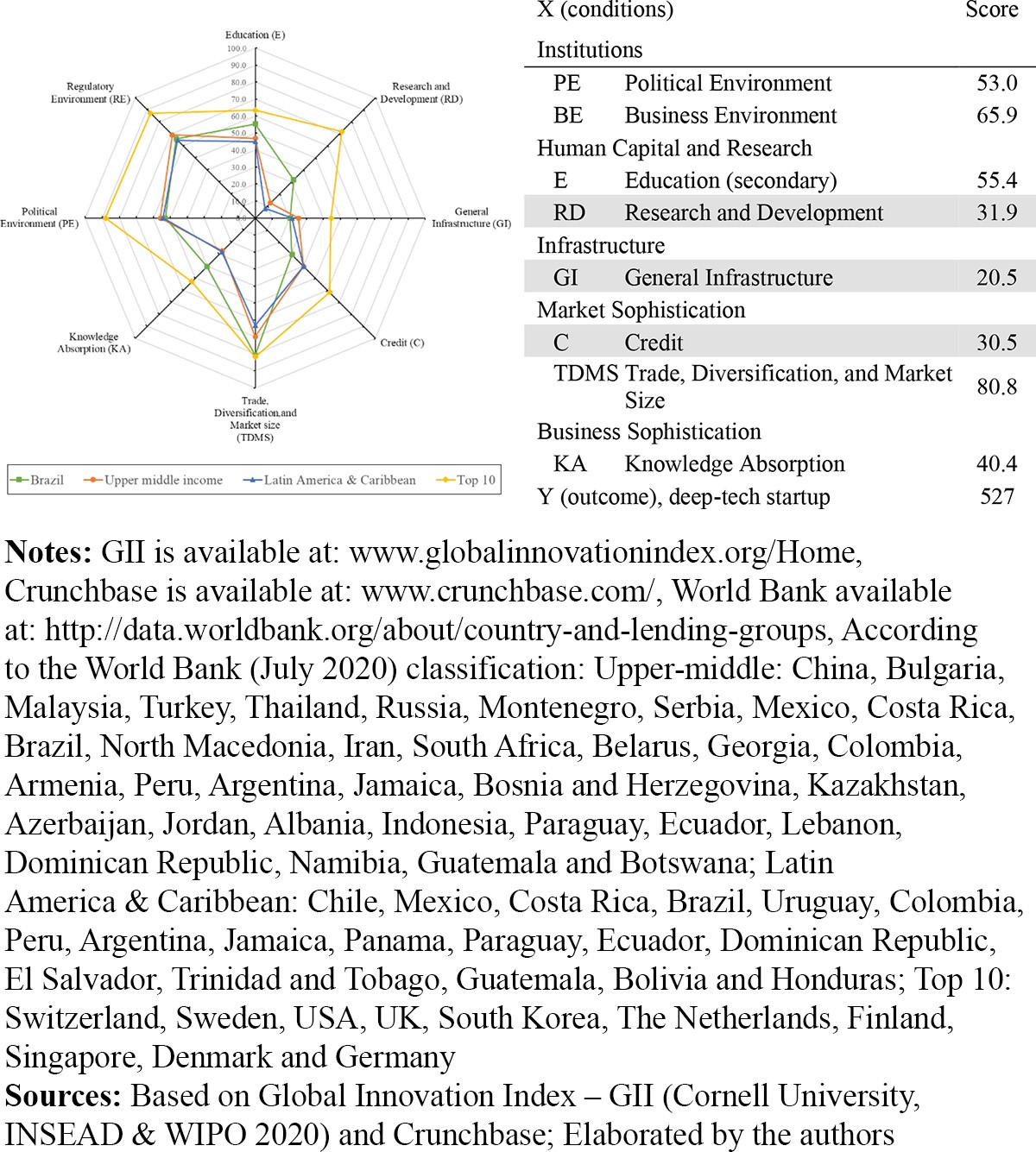 Brazil is very close to this threshold in GI (20.5 against the minimum of 18.6) and C (30.5 against the minimum of 30.3). Thus, attention is needed to improve to overcome the fragilities of these conditions. Therefore, for the Brazilian EE to have the possibility of originating deeptech ventures, allocating efforts – in terms of strategic national programs and goals – to overcome the fragilities of these two necessary conditions (GI and C) is necessary.