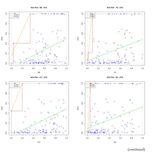Our results agree with the study of Torres and Godinho (2021), which analyzed data from 27 EU member states, with the former member UK, and applied fsQCA and NCA to discover single necessary conditions (NCA was able, whereas fsQCA was not), finding that “Formal