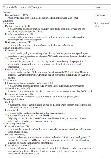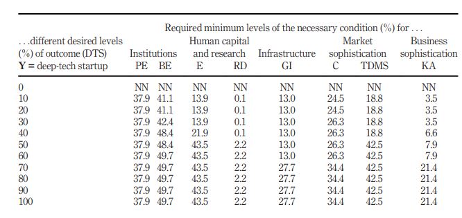 institutions, regulations and taxation” (Table 3 at p. 38) are necessary conditions for what the authors called digitally enabled unicorns and new business creation. Regarding the regulatory environment (RE), the results showed a nonsignificant value; therefore, it cannot be a necessary condition for deep-tech entrepreneurship.