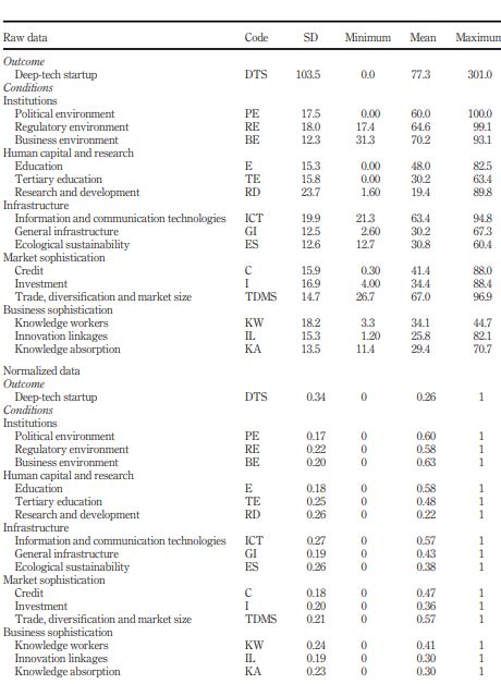 To run the NCA we normalized the data from 0 to 1, although it is not needed for NCA purposes. We applied the max-mix method ([Max value observed]/[Max Min]). Outliers’ values were identified and replaced by the interquartile interval method, an approach used in EEs composite indices such as the Global Entrepreneurship Index (Ács et al., 2019) and the European Innovation Scoreboard 2022 (Hollanders et al., 2022). Appendix 1 brings the descriptive statistics for all variables in raw (original) data as well normalized.