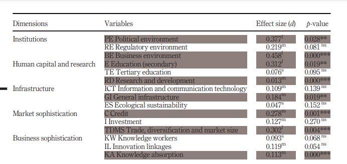 Finally, the last dimension – business sophistication – showed that only knowledge absorption (KA) had both significant effect size and p-value over the threshold. Although knowledge workers (KW) and innovation linkages (IL) have effect sizes greater than zero, their p-values are slightly higher than 5% (0.68 and 0.54, respectively). Knowledge absorption (KA) finds support both in seminal (Kim, 1997) and more recent literature, such as the study of Khan and Tao (2022) that used the same data source as we did – the GII – and encountered evidence of positive correlation between knowledge absorption and innovation performance of manufacture firms.