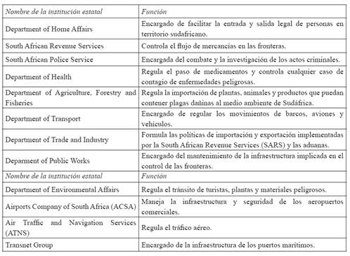 En el caso de la Border Managment Agency, el Gobierno sudafricano busca integrar en un sólo organismo a diversas instituciones estatales relacionadas directamente con el tema migratorio. En la Tabla 1 se puede observar una lista de instituciones involucradas en el tema y las funciones que realizan en esta materia.