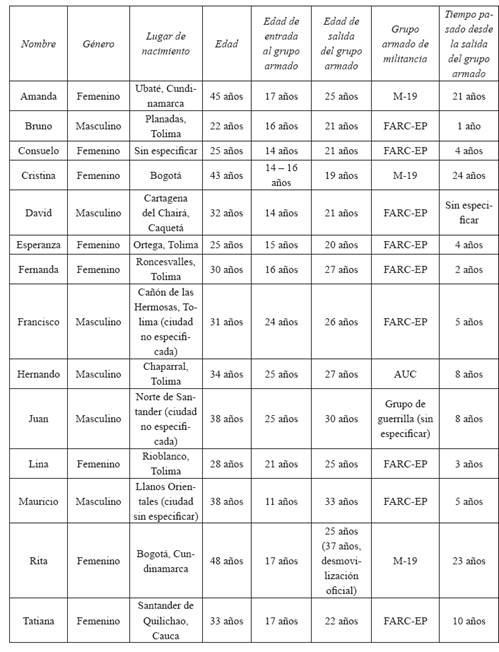 A continuación se presenta la Tabla 1, en la cual se detalla información de las catorce personas entrevistadas (nombres -todos anonimizados-, sexo, lugar de nacimiento, edad, edad de entrada y de salida del grupo armado, grupo armado al que pertenecieron, y cantidad de años que pasaron entre la salida del grupo armado y el momento de realización de la entrevista).