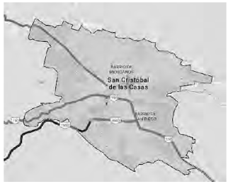 Las siguientes dos secciones las dedico a las iglesias estudiadas. Como ya lo mencioné en la introducción, ambas se localizan en el Periférico Norte de la ciudad de San Cristóbal de Las Casas. La primera de ellas se encuentra en la Colonia Getsemaní y la segunda en la Colonia Paraíso (Figura 2). Pese a que en ambas la comunidad de creyentes pertenece a la misma etnia, la religiosidad, es decir, la manera en cómo viven su religión, es muy diferente y está influenciada por la doctrina adoptada en cada iglesia, lo cual también repercute en la construcción, uso y significado de sus templos, como lo explico a continuación.