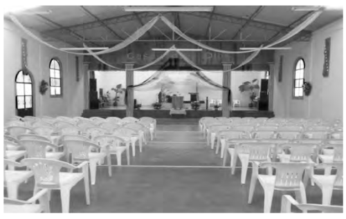 El interior del templo da la sensación de un espacio de tranquilidad porque se encuentra pintado de colores blanco y celeste e iluminado de luz blanca. El púlpito es una plataforma, un elemento simple que busca más resolver una cuestión práctica de visibilidad y organización del espacio que de dar significación simbólica excluyente (Figura 4). Lo mismo ocurre con la marquesina, un lugar destinado a aumentar la cabida del templo y que no posee la elegancia del ‘coro’ católico. El templo acoge así a 340 personas aproximadamente.