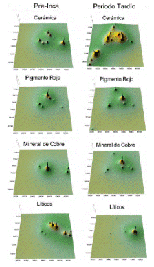 Por otra parte, la proporción de cerámica de los sitios, caminos y senderos durante el Horizonte Tardío aumenta de modo considerable, a diferencia de los sitios preincaicos. Esto sugiere una mayor ocupación residencial en los campamentos mineros y un mayor tráfico en rutas de circulación durante dicha época. Con respecto a la distribución espacial de las actividades minero/artesanales y las ocupaciones residenciales durante el período en cuestión, los datos de las unidades de conteo de materiales por sitio fueron representados en superficies de densidad creadas por el método de interpolación al inverso de distancia, por medio del software Surfer 11. En la Figura 2 podemos apreciar que la cerámica de época inca se distribuye principalmente a lo largo del Qhapaq Ñan, los senderos, y en un área concentrada al oeste de la sierra Cachiyuyo de Llampos, que es donde se localizan los sitios CH1, CH2 y CH3. Esto marca un gran contraste con la situación previa, en que no hay ninguna concentración espacial en torno al área por donde luego se emplazaría el Qhapaq Ñan, lo que sugiere que dicha ocupación tardía está directamente relacionada con su presencia. En cuanto al mineral de cobre, este se concentra en el sitio CH1 y podemos ver que, por medio de los sitios Exterior 9 y QÑ8, estarían ingresando parte de dichos minerales al flujo del Qhapaq Ñan. La misma situación se repite en el caso del pigmento rojo, que además de estar presente en los sitios mencionados, también aparece en baja proporción en el Tambo Medanoso, el único sitio propiamente incaico en el área de estudio.