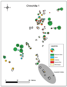 Chinchilla 1 (CH1) es el sitio de mayor superficie y el primero identificado en el sistema de campamentos mineros localizados en la sierra Cachiyuyo de Llampos, los cuales se interconectan por medio de senderos destinados a la exploración y explotación minera. Este campamento minero consiste en aproximadamente una hectárea y media de superficie con diversos conjuntos de estructuras semicirculares de carácter residencial, además de espacios destinados a actividades artesanales (Figura 3). Diversas áreas de fogones, cenizas y huesos de animales sugieren la pre- paración separada de alimentos en los diversos conjuntos residenciales a lo largo de la extensión del sitio. La minería en CH 1 consistió en la extracción de fragmentos relativamente uniformes de turquesa y crisocola desde las vetas de mineral contiguas, cuya fuente se encuentra a unos 300 metros de distancia. Dichos fragmentos fueron luego reducidos de tamaño en dos áreas del sitio, una al noreste y otra al suroeste. El mineral de cobre fue procesado en pequeñas unidades, “formatizado” y pulido con el fin de manufacturar cuentas de collar, proceso que también fue realizado en menor escala en asociación con las estructuras residenciales del sitio.