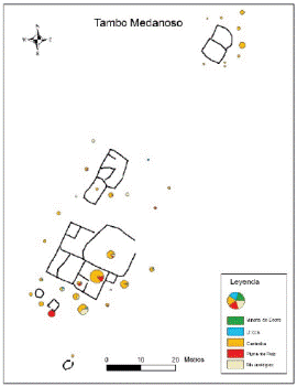 El tramo del camino inca ubicado en las inmediaciones del campamento minero CH1 no poseía estudios sistemáticos previos, salvo menciones generales a escala regional (Iribarren y Bergholz, 1972; Molina, 2004). Luego de sucesivas campañas de prospección en 2013 y 2014, fueron registrados en este segmento diversos grupos de estructuras circulares de estilo arquitectónico local, además de una serie de senderos prehispánicos informales localizados a los pies de la sierra Cachiyuyo de Llampos y paralelos al Qhapaq Ñan. La principal infraestructura inca de la zona es el Tambo Medanoso (Figura 4), localizado a 12 km al sur de CH1. Este posee arquitectura rectangular compuesta estilo inca (tipo RPC), así como cerámica diagnóstica tardía en superficie.