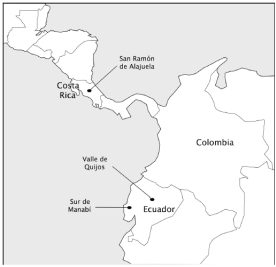 En contraste, las comunidades nucleadas con más casas funcionalmente interdependientes deberían manifestarse arqueológicamente a través de la presencia de más unidades composicionales distintivas, cada una con diferentes tipos y cantidades de restos materiales, mostrando que las casas se centraron cada vez más en diferentes tipos de tareas (y, por tanto, descartando así diferentes tipos y cantidades de desechos). En esencia, deberíamos encontrar lo contrario de lo que se espera para las casas dispersas: un alto grado de diversidad de artefactos entre un lugar y otro. Nuestro objetivo es precisamente comparar este tipo de datos para tres poblaciones prehistóricas repartidas a lo largo de Centroamérica y Sudamérica, en las regiones del sur de Manabí (en la zona costera de América del Sur) (Martín, 2009, 2010b, 2010c), el Valle de Quijos (en las tierras altas de América del Sur) (Cuéllar, 2006, 2009) y San Ramón de Alajuela (en los valles centrales de América Central) (Murillo, 2009, 2010a, 2011) (Figura 1). Todos los datos utilizados a continuación para reconstruir la demografía y la estructura de la comunidad son de libre acceso en la base de datos de Arqueología Comparada (http://www.cadb.pitt.edu), con sede en el Centro de Arqueología Comparada de la Universidad de Pittsburgh.