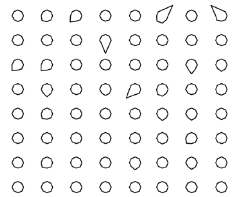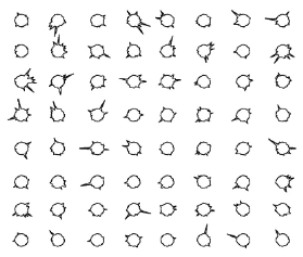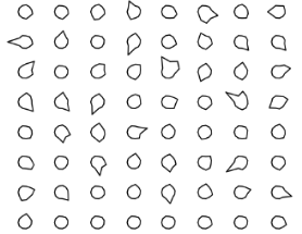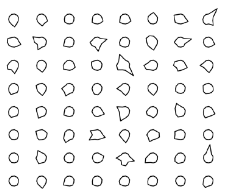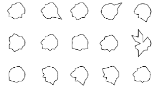 Para evaluar estas expectativas se analizaron muestras de artefactos recolectados en una prospección sistemática regional. Los artefactos recolectados se analizaron como muestras aleatorias de artefactos recolectados en todas las comunidades y cuyas áreas de recolección fueron sistemáticamente ubicadas y medidas en cada hectárea prospectada (Drennan, Berrey y Christian, 2015). Los contenidos de cada muestra de las tres comunidades más grandes de San Ramón (E, H y F) fueron representados gráficamente utilizando íconos multivariados (Figuras 4, 5 y 6) (más detalle acerca de este tipo de análisis en Martín y Murillo, 2014). Estos retratan como “cúspides”, alrededor de un eje central, las proporciones de los diferentes tipos de artefactos en cada muestra. El índice utilizado mide cuánto se desvía de la media de esa categoría una observación dada. Por ejemplo, expresa en desviaciones estándar lo inusual que es para una muestra dada el haber recuperado ocho tiestos de algún tipo con base en el promedio de tiestos de ese tipo recuperados por cada otra muestra en esa comunidad. Esto nos permite ver con eficiencia cuándo una muestra contiene: 1) proporciones inusualmente grandes de cualquier artefacto determinado (grandes cúspides) y 2) muchas categorías de artefactos inusualmente grandes (muchas cúspides).