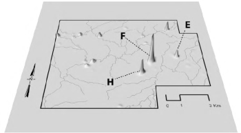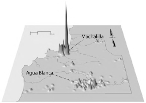 Un tercer ejemplo de asentamiento viene de la región sur de Manabí, donde una inspección sistemática de cobertura completa también fue llevada a cabo por uno de nosotros en un área de 100 km² alrededor del Valle de Buenavista y su costa cercana (ver nuevamente Figura 1). La mayor parte del área de estudio consiste en un bosque seco semiárido tropical donde las estaciones secas son largas y donde las modestas precipitaciones se alternan con una estación lluviosa errática y corta desde diciembre hasta abril. La naturaleza de la estación lluviosa hace que la agricultura a gran escala sea difícil e impredecible y los residentes actuales basan la mayor parte de su subsistencia en la pesca o en la ganadería moderada de ganado o de cabras (Bauer, 2007).