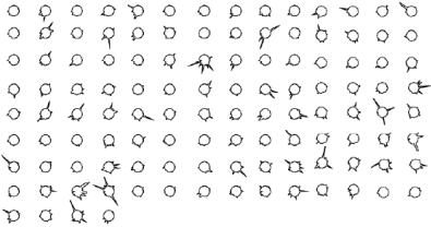 En este punto, la Figura 8 revela que casi la mitad de las muestras de Machalilla tienen proporciones inusualmente grandes de categorías específicas de artefactos (grandes cúspides), y a menudo para varias categorías (muchas cúspides), lo que sugiere una gran variación entre las actividades que fueron llevadas a cabo en cada lugar. Las fincas dispersas (Figura 10), en contraste, tienden a verse abrumadoramente similares; menos del 10% de las muestras manifiestan cantidades de ar- tefactos inusuales en comparación con otras muestras dispersas, lo que indica más similitud en las actividades llevadas a cabo en cada una de estas locaciones. Como se predijo, el asentamiento seminucleado de Agua Blanca (Figura 9) cae en algún lugar del medio de los otros dos: alrededor de un tercio de las muestras manifiestan números de artefactos inusualmente grandes. La comparación muestra que Mach lilla es el asentamiento con el mayor grado de variación interna y complementaria en cantidades y tipos artefactuales, lo que sugiere interdependencia más pronunciada y más especialización en ese lugar que en los otros dos.