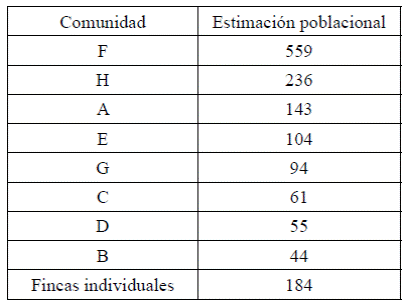 Similar a Quijos, San Ramón tiene suelos muy fértiles asociados a los sedimentos volcánicos que cubren el fondo del valle (Bergoeing, 2007: 220). También como en Quijos, la topografía es muy quebrada y desigual. Sin embargo, durante el período Cartago las personas en San Ramón parecen haberse organizado en torno a comunidades, en su mayoría caseríos y pequeñas aldeas (Figura 3), en las que tenían acceso inmediato a sus vecinos (Murillo, 2010a, 2010b). La Tabla 1 muestra la distribución de la población estimada para cada comunidad local para el período Cartago. La mayor parte de la población regional, o alrededor del 88%, residía en algún tipo de comunidad pequeña, pero altamente aglomerada. Muchas de las comunidades tienen una población media estimada en alrededor o por debajo de un centenar de personas, y es probable que representen grupos de parentesco de familias extendidas. Sin embargo, la mayor parte de ellas contenían varios cientos de personas y, posiblemente, podrían haber reunido a varios de estos grupos de parentesco.