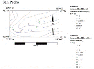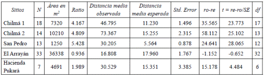 Sin embargo, solamente el sitio El Arrayán muestra una fuerte tendencia a ser un asentamiento nucleado (r = 0,936, p > 0,5); el resto de sitios tienen resultados con problemas de límites (área). San Pedro, subjetivamente, se ve nucleado, pero los resultados del ratio son mayores a 1, lo que indica que es un conjunto bajo un patrón de asentamiento disperso.