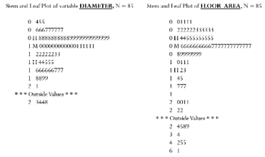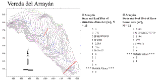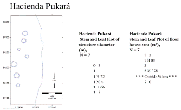 Las estadísticas descriptivas proveen medias individuales por sitio para el diámetro de las 85 estructuras (vereda El Arrayán = 12,5 m; Chilmá 1 = 9,7 m; Chilmá 2 = 12 m; Hacienda Pukará = 13,7 m; y San Pedro = 9,8 m), y para el área del suelo de ocupación (vereda El Arrayán = 144.618 m²; Chilmá 1 = 87.909 m²; Chilmá 2 = 141.976 m²; Hacienda Pukará = 25.569 m²; y San Pedro = 77.379 m²). En toda la muestra, se observa una diversidad de tamaños inclusive al interior de cada sitio. Los gráficos de tallo y hojas resultan una opción acertada para observar con mayor detalle las similitudes y las diferencias entre los sitios en cuanto al diámetro en metros y al área del suelo ocupacional en metros cuadrados (Figuras 6-10).
