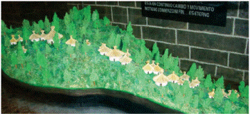 La información arqueológica de los conjuntos de casas que forman parte de la muestra para el presente estudio proviene de un programa de reconocimiento, prospección y excavación (Vásquez et al., 2006) llevado a cabo en la provincia del Carchi desde 2005 hasta 2007, con la excepción de la vereda El Arrayán, cuya información es de carácter bibliográfico. La vereda El Arrayán, después de su levantamiento topográfico y su excavación, fue destruida para desarrollar un proyecto de urbanización. Sin embargo, gracias a las investigaciones de Uribe (1977-1978), se conoce que existían 33 estructuras circulares de una sola entrada que fueron visibles en la superficie. La vereda El Arrayán probablemente estuvo localizada frente a la meseta de Mira- flores (Nariño). En 2007, cuando quise visitar El Arrayán como sitio arqueológico, los vecinos me dijeron que ya no existía y que podría ver una maqueta del mismo en el Museo del Santuario de la Virgen de Las Lajas, cerca de Ipiales (Figura 2). En este museo se exhibían además materiales de filiación cultural tuza, provenientes de las tumbas de Miraflores, también producto de las excavaciones de Uribe.