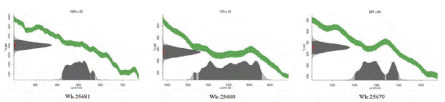 A una altitud media de 2000 m. s. n. m., en las estribaciones occidentales del complejo volcánico Cerro Negro-Chiles, en la vía a Maldonado, se encuentra un conjunto arqueológico de estructuras que se ha denominado Chilmá. Este antiguo asentamiento de filiación pasto se localiza en el caserío de Chilmá Bajo, a orillas del encañonado del río Chilmá, tributario del San Juan. Los actuales pobladores de Chilmá Bajo se dedican a la ganadería y al cultivo rotativo de maíz, tomate de árbol, mora, uvilla y cítricos. Los lugares arqueológicos se pueden observar en el paisaje físico con facilidad y no han sido eliminados del todo como los del páramo. El topónimo de Chilmá no aparece en las fuentes etnohistóricas que he consultado, pero en cambio es común encontrar relatos acerca del “pueblo de Mayasquer” (mencionado, por ejemplo, por Antonio Rodríguez de San Isidro en 1638). El resguardo de Mayasquer está ubicado a casi un kilómetro en línea recta de Chilmá Bajo, pero al otro lado de la frontera (Vásquez et al., 2006). Durante la excavación arqueológica en Chilmá, se recuperaron materiales culturales de tipo cerámico y lítico, en relación con estructuras circulares mapeadas en un área de 188,15 ha, asociadas a modificaciones artificiales del terreno relativas a la agricultura, como terrazas, camellones y una posible albarrada (Vásquez et al., 2006). También se tomaron muestras de suelos arqueológicos para el estudio paleoambiental (Astudillo, 2007) y se colectaron muestras de carbón, de las cuales se enviaron tres para análisis de datación por AMS: Wk-25679, Wk-2568 y Wk-25681. Los resultados fueron calibrados con el programa Clam 2.2, desarrollado por Blaauw (2010) y se presentan en la Figura 4. Para la fecha 1604±30, los dos posibles rangos de edades calibradas son 423-554 cal d. C. (p = 88,1) y 556-573 cal d. C. (p = 6,7), calibradas a 2σ con Clam 2.2 (Reimer et al., 2013). Para la fecha 657±30, los dos posibles rangos de edades calibradas son 1300-1369 cal d. C. (p = 70) y 1372-1399 cal d. C. (p = 24,8), calibradas a 2σ con Clam 2.2 (Reimer et al., 2013). Finalmente, para la fecha 375±30, los dos posibles rangos de edades calibradas son 1465-1471 cal d. C. (p = 2,1) y 1476-1631 cal d. C. (p = 92,7), calibradas a 2σ con Clam 2.2 (Reimer et al., 2013).