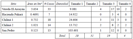 Las estructuras de la vereda El Arrayán se comportan distinto al resto de los sitios. En El Arrayán, todas las estructuras de todos los tamaños están relacionadas hasta cierto punto (Tabla 2). El tamaño 1 de estructuras corresponde mejor con las de tamaño 2 (4,2%), hay correspondencia positiva entre las estructuras de tamaño 1 y 3 (3,2%); en cambio, no se corresponden casi entre 1 y 4 (1,5%) y tampoco entre 2 y 3 (1,5%). La correlación más débil es entre las estructuras de tamaño 3 y 4 (1,2%), y esto no se ha visto en el resto de la muestra. En el caso de la Hacienda Pukará, las agrupaciones de estructuras son sencillas y no hay un patrón (Tabla 3); sólo existen estructuras de tamaño 2 y 3, y no tienen una correlación fuerte (2,2%) como en el l de la vereda El Arrayán.