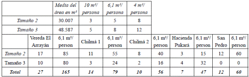 En resumen, los porcentajes de superposición descritos arriba permiten sugerir que, por lo general, las unidades domésticas pastos no siempre incluyen un cuarto de almacenaje, pero cuando esto ocurre, estos cuartos están asociados a casas pequeñas de tamaño 2. Esta correlación se observa en cuatro de los cinco aglomerados de estructuras tanto en el páramo como en el pie de monte (Tabla 7). Se puede afirmar que en toda la muestra hay una relación relevante entre las estructuras de tamaño 2 y 3 que podrían haber funcionado como viviendas. A partir de esta premisa, se usaron solamente estas estructuras para calcular el índice de Naroll (1962 con base en Shelach [2005: 333]) y producir estimados de densidad poblacional, los cuales se presentan en la Tabla 7.