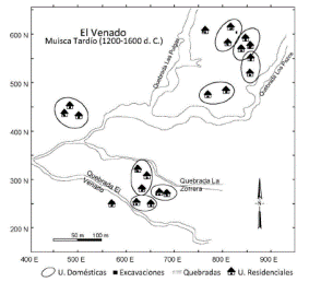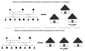 La disposición de las evidencias arqueológicas de viviendas en la comunidad de El Venado en el Valle de Samacá ha revelado la presencia de grupos residenciales que se asentaron de dos formas, básicamente: en viviendas individuales o grupos de dos a tres casas formando líneas rectas, o dispuestas a manera de triángulo (Figura 7). Estos grupos de viviendas han sido denominados “grupos patio”. Varios de esos grupos formarían un “barrio” (Boada, 2007: 216). Estos rasgos se han constatado en otras regiones del altiplano cundiboyacense (Boada, 1987, 1998, 2000; Salamanca, 2001; Kruschek, 2003: 95-178; Romano, 2003, 2009; Henderson y Ostler, 2005; Salge, 2007; Fajardo, 2011). Extensas excavaciones llevadas a cabo en Soacha y Las Delicias han mostrado que las viviendas del período Muisca Temprano (las fechas de radiocarbono de ese caso son: 1035 ± 115 d. C. y 1230 ± 110 d. C. (Boada, 2000: 25) eran de planta circular, sus diámetros oscilaban entre 5,3 y 6,2 m y cubrían un área de entre 28 y 40 m2 (Enciso, 1990; Boada, 2000: 24). En Soacha, los grupos de dos a tres casas en disposición recta ocuparon una superficie de entre 104 y 160 m2. Allí, un grupo de tres casas que formaban un triángulo ocupó un área de alrededor 240 m2 (Romano, 2009: 155-156). Esos grupos de viviendas pudieron corresponder a familias estructural y demográficamente diferentes a la familia nuclear.