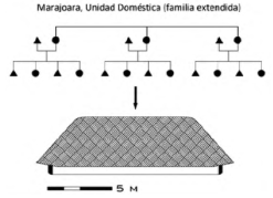 Aunque en estas áreas no se han excavado casas enteras, se han determinado sus tamaños mediante la medición de la superficie plana en la cima de un montículo y por estudios de resistividad magnética (Roosevelt, 1991; Schaan, 2004). Cada estructura habitacional pudo albergar a una familia extensa con un rango de gente entre las 35 a 60 personas, con un promedio de 40 por familia (Roosevelt, 1991: 341-342). También se ha sugerido un rango de 12 a 60 personas por familia, con un promedio de 50 por cada unidad multifamiliar inicial, y de 15 personas por cada segunda y tercera unidad construida cuando la población de la familia creció (Schaan, 2004: 171). Estos datos, sumados a la información de familias individuales enterradas en urnas singulares decoradas con representaciones de figuras femeninas, han llevado a proponer la existencia de unidades domésticas organizadas en “familias extendidas matrilocales” en las secuencias de desarrollo de los cacicazgos marajoara (Roosevelt, 1991: 408) (Figura 11).