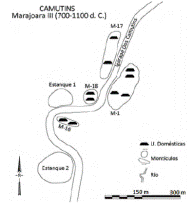 En las sociedades marajoara de Camutins se evidenciaron importantes cambios demográficos desde el período Marajoara I al IV. Entre Marajoara I y II aparecieron las primeras urnas estilizadas como parte de los ajuares funerarios, a la par que el comercio a larga distancia tuvo una importancia singular; sobresalen una cantidad de montículos esparcidos a lo largo del curso de los ríos que no presentan diferencias sustanciales en sus tamaños. Entre los períodos Marajoara III y IV, por el contrario, una población mayor con respecto a la de los períodos anteriores se organizó en un sistema social complejo, en que las jerarquías sociales estaban plenamente institucionalizadas; estaba compuesto de por lo menos 34 montículos localizados a lo largo del río Igarapé dos Camutins (Schaan, 2004: 152-167). Para ese tiempo, dos grupos de asentamientos semicompactos, cada uno representado por cuatro montículos (Figura 12) de gran tamaño, estaban vinculados a una serie de asentamientos dispersos de montículos menores (Schaan, 2004: 164). En los montículos mayores, localizados hacia la parte alta y baja del río, residieron grupos de élites. En medio de estos, localizados a lo largo de la línea costera y los afluentes del río, se asentaron los comuneros. Los asentamientos agregados de la parte baja se localizaron en un gran montículo adyacente a otros dos usados con fines ceremoniales y públicos, todos adjuntos a sistemas de control y manejo de aguas y grandes estanques para el almacenamiento de recursos fluviales.