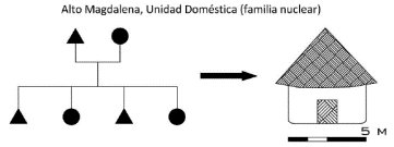 Se ha constatado arqueológicamente que desde el período Formativo hasta el Reciente las viviendas eran de forma circular u ovalada, y normalmente no superaban los 6 m de diámetro y los 25 m2 de superficie (Jaramillo, 1996: 80-90; Cubillos, 1980; Duque y Cubillos, 1981: 24-35, 1988: 81-82; Llanos y Durán, 1983: 50-53; Llanos, 1988: 54-58; Blick, 1993: 259; Sánchez, 1991: 34-40, 2015: 231-232; Romano, 1998: 54; Drennan, 2000: 24-25, 38-39; Quattrin, 2001: 32-40, 63-68). Entre este conjunto de evidencias se cuenta con un caso aislado, conocido como “la casa ceremonial”, en el sitio de La Estación, San Agustín, con casi 9 m de diámetro y 58,8 m2 de superficie (Duque y Cubillos, 1981: 26). Estimaciones espaciales denotan que esas estructuras fueron el lugar de residencia de pequeños grupos sociales o familias nucleares compuestas de seis personas (Jaramillo, 1996; Drennan, 2000: 36; Quattrin, 2001; González, 2007: 62) (Figura 3). La poca variación tanto en forma como en tamaño (a excepción del mencionado caso de La Estación), sugiere que la composición social de las unidades domésticas, la familia nuclear, fue la misma de un período a otro, y perduró a lo largo de la secuencia en los cacicazgos del Alto Magdalena. Sin embargo, se ha propuesto un número de ocho miembros para cada una de las unidades domésticas de la zona central de la comunidad central de Mesitas durante el período Clásico (González, 2007: 67).