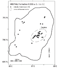 Trabajos arqueológicos en las áreas de Mesitas han brindado evidencias de 81 unidades domésticas (González, 2007). En varias de esas áreas se documentó el uso continuo del espacio por varias unidades domésticas a lo largo de la secuencia. Del Formativo 1 se localizaron 6 unidades, 3 de las cuales (el 50%), formaban parte de una zona central de la comunidad. Del Formativo 2 se hallaron 31 unidades, de las cuales 18 (el 58%), estaban localizadas en la zona central. Del Formativo 3 se encontraron los rastros de 38 casas, 27 de ellas (el 71%) se ubicaron en la zona central (Figura 5). Por último, 75 unidades formaron parte de la comunidad durante el Clásico Regional, 41 de esas (el 55%) hacían parte de la zona central (Figura 6) (González, 2007: 33). De manera preliminar se ha calculado un número de 98 unidades para el período Reciente (Romano, 2013).