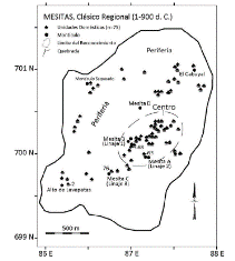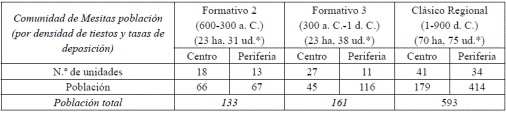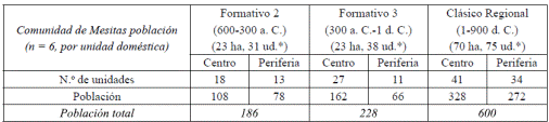 La formación de la comunidad central de Mesitas se estableció a partir del Formativo 2 y contó con la presencia de 31 unidades domésticas. Así, durante el Formativo 2 y el 3 las comunidades pudieron haber estado formadas por pequeños linajes que agrupaban de 6 a 8 grupos familiares, en tanto que durante el período Clásico esos linajes incrementaron su tamaño de 13 a 15 grupos familiares con 115 a 120 miembros cada uno (ver nuevamente Tablas 2 y 3). Durante el Clásico Regional se observaron cambios en el tamaño de las unidades domésticas, que contaron con 8 personas o hasta 10, las que pertenecieron a la zona central, y 6 aquellas localizadas en la periferia (González, 2007: 76-77).