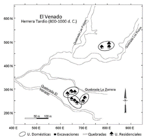 La comunidad de El Venado ocupó un área de 14,4 ha (ca. 2,5 km2) distribuidas en 9 zonas: El Rubí, La Esmeralda, Chávez, El Carrizal, El Cebollal, La Vega, El Recuerdo, Abejas y San Antonio. Del período Herrera hay evidencia de 11 viviendas con un área media de 117 m2. Estaban agregadas en, por lo menos, 4 familias compuestas, que formaban dos “grupos patio”. Tres de ellas, con 8 unidades residenciales, estaban localizadas en La Esmeralda; la otra, con 3 unidades, estaba ubicada en la zona de El Recuerdo (ver nuevamente Figura 8). La población ha sido calculada en 55 personas, con base en un tamaño promedio de 5 personas por unidad (Boada, 2007: 83) (ver nuevamente Tabla 4).