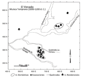 La presencia de grupos sociales muiscas que habitaron la vasta región del altiplano cundiboyacense es tan antigua como variable en el tiempo (Cardale, 1988-1989; Enciso, 1995; Langebaek, 1995, 2000, 2001, 2008; Boada, 1998, 2000, 2006, 2007; Salamanca, 2001; Kruschek, 2003; Romano, 2003, 2009; Henderson y Olster, 2005; González, 2007; Salge, 2007; Fajardo, 2011; Argüello, 2015). Esta variabilidad se ha visto representada en una serie de periodizaciones que aún claman por consenso. En este artículo se ha seguido la cronología presentada para el sitio de El Venado en el Valle de Samacá (Boyacá), en tanto que hace parte de los estudios de comunidad bajo escrutinio. Allí, se propuso una secuencia dividida en tres períodos: el Herrera Tardío (800-1000 d. C.), el Muisca Temprano (1000-1300 d. C.) y el Muisca Tardío (1300-1600 d. C.) (Boada, 2007). De manera similar a lo que sucedió en Mesitas, en el Alto Magdalena, a largo de esta secuencia se ha visto que la comunidad de El Venado se formó a partir de una pequeña porción de unidades domésticas, cuyas poblaciones fueron incrementándose en el tiempo.