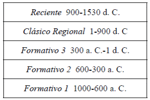 Las sociedades del Alto Magdalena se desarrollaron a lo largo de 2.500 años. En las regiones del Valle de la Plata (Drennan, 2006b) y San Agustín-Isnos (Sánchez, 2000; González, 2007) este lapso se ha dividido en una secuencia de cinco períodos: 1) Formativo 1 (1000-600 a. C.); 2) Formativo 2 (600-300 a. C.); 3) Formativo 3 (300 a. C-1 d. C.); 4) Clásico Regional (1-900 d. C.), y 5) Reciente (900-1530 d. C.).
